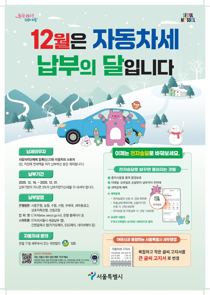 이번 자동차세 납부 대상은 12월 1일 기준 구에 등록된 자동차, 이륜차, 건설기계의 등록원부상 소유자이며, 2025년 연세액 납부자는 제외된다.
