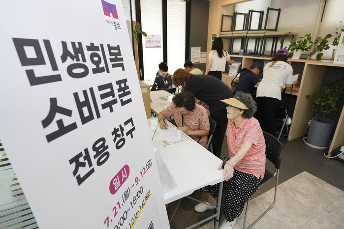 종로구(구청장 정문헌)가 ‘민생회복 소비쿠폰’ 1차 신청 접수를 시작했다. 신청은 17개 동주민센터뿐만 아니라 온라인 신청도 가능하다. 사진은 민생회복 소비쿠폰 신청 첫날 청운효자동주민센터의 모습.