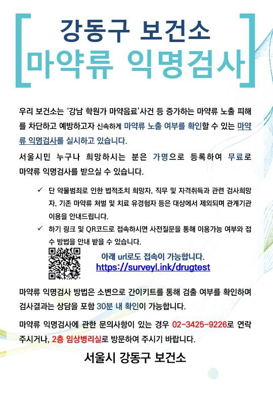 [시민일보 = 이대우 기자] 강동구(구청장 이수희) 보건소가 마약 노출 여부를 빠르게 확인하고 치료로 연계하는 ‘마약류 익명검사’를 시행한다.