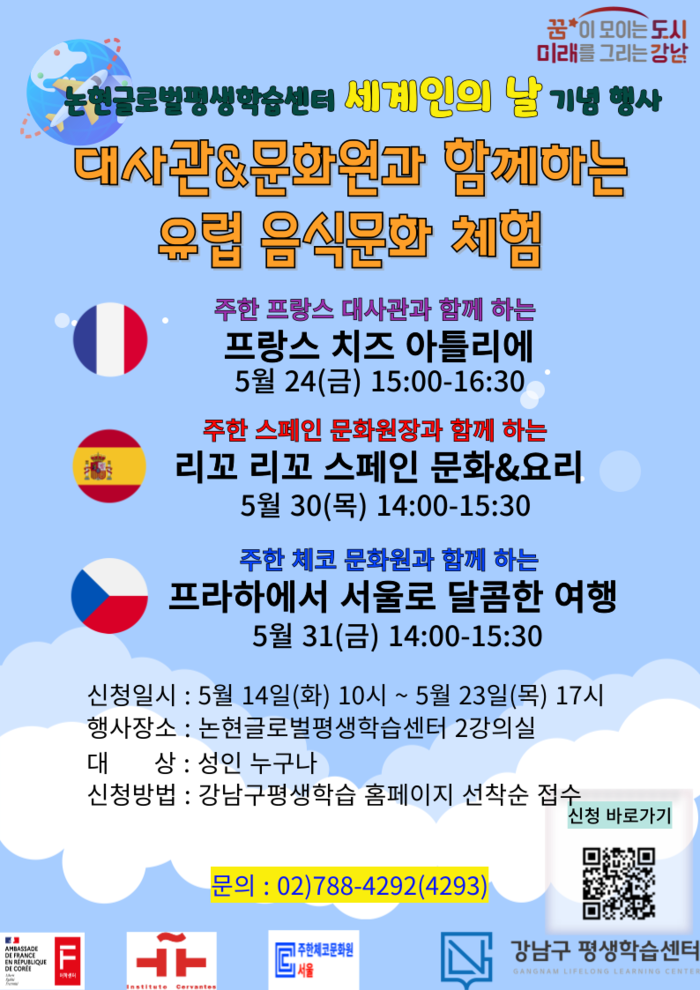 [시민일보 = 이대우 기자] 강남구(구청장 조성명)가 세계인의 날(5월20일)을 맞아 24일부터 논현글로벌평생학습센터(논현로131길 40)에서 프랑스, 스페인, 체코 등 유럽 3개국의 음식문화 체험 프로그램을 개최한다.