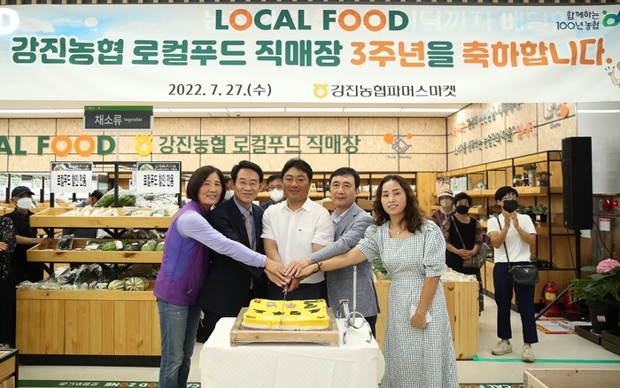 | ▲ 강진원 강진군수(왼 쪽부터 2번)가 지난 7월 27일 강진농협 로컬푸드 직매장 3주년 개장을 기념해 관계자들과 축하 떡 케이크 절단 기념촬영을 하고 있다. / 강진군 제공 |