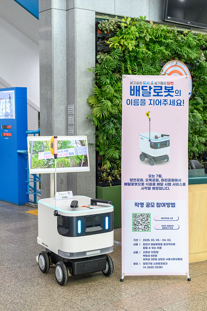 구는 서비스 운영에 앞서 구민의 관심과 참여를 유도하고자 ‘배달 로봇 작명 공모 이벤트’를 4월2일까지 추진한다. 구청 홈페이지 배너 또는 구청 로비에 전시된 로봇의 QR코드를 통해 신청할 수 있으며, 관심 있는 구민 누구나 참여할 수 있다.