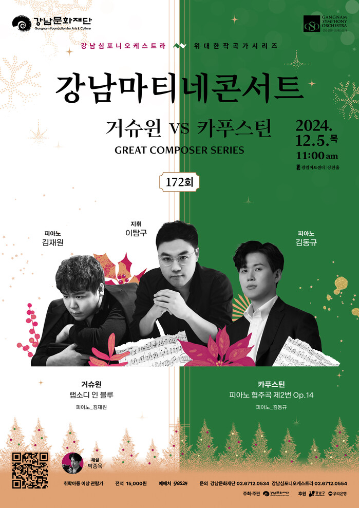 올해의 마지막 강남마티네콘서트의 화려한 대미를 장식하기 위해 강남심포니가 준비한 제172회 강남마티네콘서트에서는 재즈와 클래식의 조화가 돋보이는 거슈윈의 명곡 <랩소디 인 블루>와 작곡가 카푸스틴 특유의 재즈적 색채가 담긴 <피아노 협주곡 제2번 Op.14>을 피아니스트 김재원과 김동규의 연주로 만나본다. 한 해를 돌아보며 새로운 시작에 대한 기대와 희망을 느끼는 연말, 재즈와 클래식의 만남을 통해 연말의 따뜻한 분위기와 감성적인 순간을 선사한다. 김재원과 김동규의 감미로운 멜로디와 화려한 피아노 패시지로 송년 분위기를 한껏 자아내며 더욱 특별한 공연으로 2024년 강남마티네콘서트 시리즈를 마무리한다.
