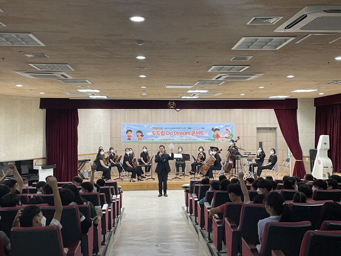 서울 강남구 산하 강남문화재단은 2022년 강남예술단 찾아가는 공연 <톡톡! 음악배달부> ‘두드림 Do Dream 콘서트’를 아이들에게 꿈과 희망을 전달하기라는 주제로 지난 16일 서울 언북초등학교에서 개최했다. 사진은 4학년 학생들을 대상으로 두드림 Do Dream 콘서트를 진행하고 있는 모습. (사진제공=강남구청)