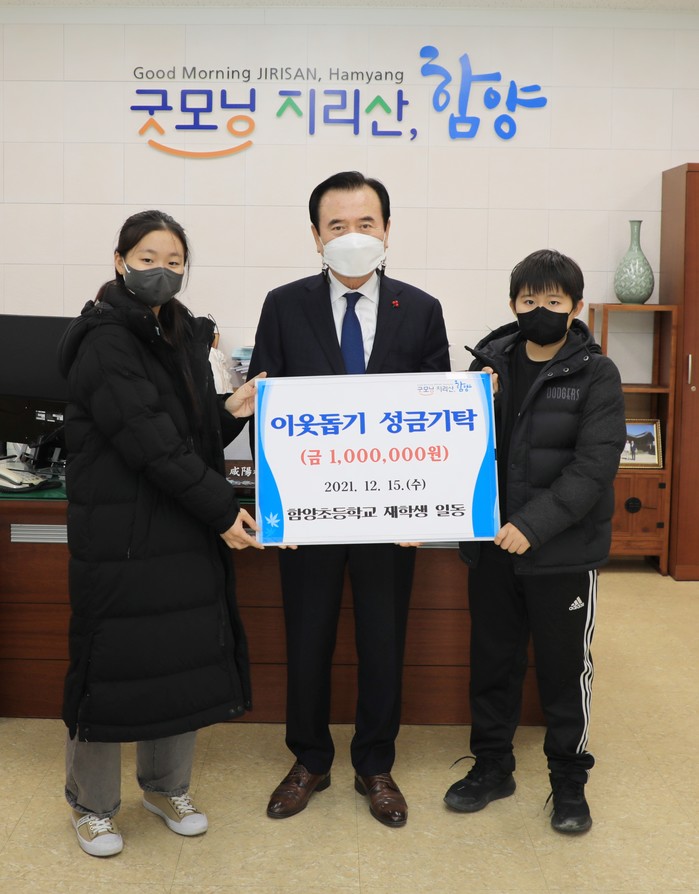 역사와 전통이 살아숨쉬는 함양초등학교 학생들이 15일 오후 2시 함양군청을 찾아와 이웃돕기 성금 100만원을 기탁하며 나눔과 사랑을 실천하였다.