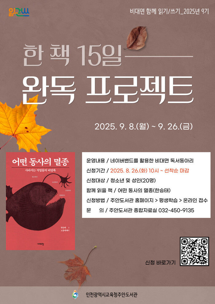[인천=문찬식 기자] 인천광역시교육청주안도서관(관장 최문정)은 8월 26일(화) 오전 10시부터 ‘2025년 9기 비대면 함께 읽기-「한 책 15일 완독 프로젝트」’참여자를 모집한다.