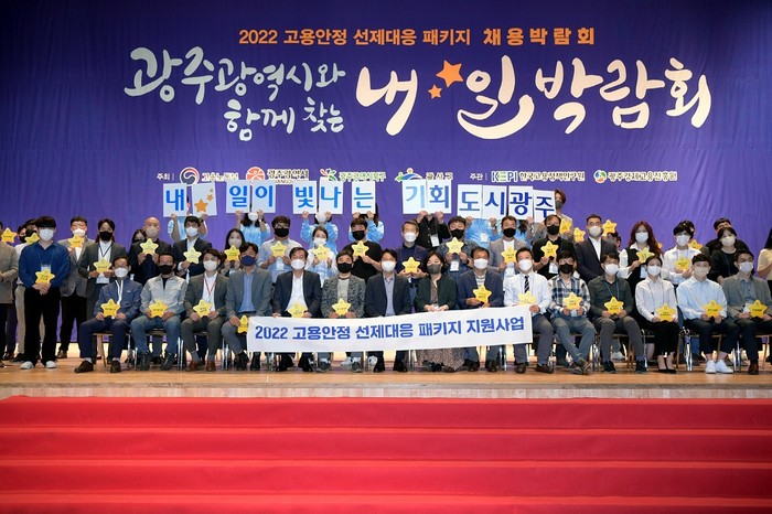 [광주=정찬남 기자] 김광진 광주광역시 문화경제부시장이 29일 김대중컨벤션센터 다목적홀에서 지역기업과 지역인재 간 원활한 일자리 매칭을 위해 열린 '내일박람회'에 참석해 참석기업, 유관기관 관계자들과 함께 기념촬영을 하고 있다./광주광역시 제공
