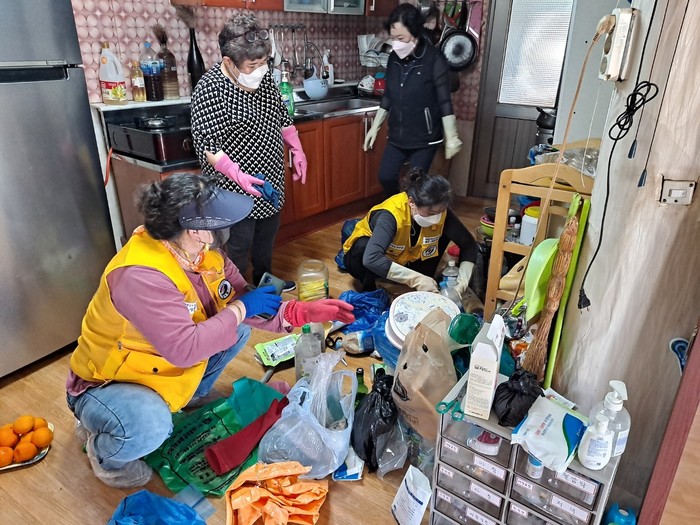 전남 진도군과 대한적십자사 광주전남지사 진도지구 협의회 임회면 봉사회가 최근 임회면에서 이동 세탁 차량을 이용해 대형 빨래에 어려움을 겪는 저소득 취약계층 20가구 77채 이불 등을 수거해 세탁·건조 후 집까지 배달하는 무료 세탁과 주거환경개선 봉사활동을 펼쳤다. 사진은 이날 봉사자들이 홀몸노인 가구에서 쓰레기 수거와 집안 청소을 하는 모습. (사진제공=진도군청)