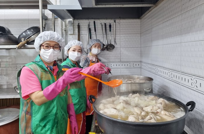 경기 수원시 장안구 정자1동 새마을부녀회가 14일 (주)SKC의 후원을 받아 ‘사랑의 복달임 행사’를 개최했다. 이날 새마을부녀회원들은 삼계탕 100인분과 겉절이 등 반찬을 만들어 지역내 홀몸노인 등 취약계층에 과일과 함께 전달했다. 사진은 부녀회원들이 삼계탕을 만들고 있는 모습. (사진제공=장안구청)