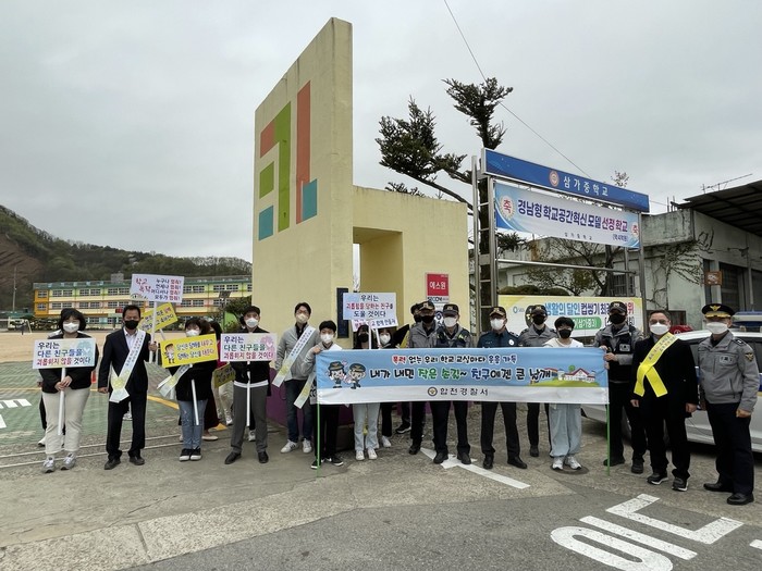 합천경찰서(서장 박정덕)는 22. 4. 14.(목) 08:10 ~ 08:30, 삼가중학교 에서 삼가중학교 교장 및 교직원, 학생 20여명과 함께 등굣길 학교폭력 예방 캠페인을 실시하였다.