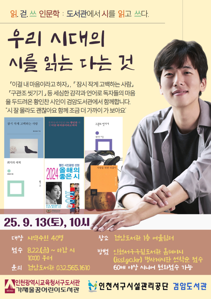 [인천=문찬식 기자] 인천광역시교육청서구도서관(관장 정연순)은 2025년 ‘지자체 연계 읽걷쓰 수요인문학’ 첫 번째 프로그램으로 9월 13일(토) 오전 10시, 검암도서관에서 황인찬 시인 초청 강연을 진행한다.
