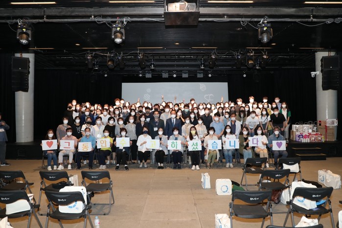 서울 마포구는 지난 17일 2022 민관사회복지종사자 워크숍을 ‘RE:fresh’라는 슬로건으로 개최했다. 팀을 구성해 미션 프로그램을 진행하는 등 복지종사자들의 직무로 인한 스트레스를 해소하는 시간을 보냈다. 사진은 워크숍에서 유동균 구청장(두 번째 줄 가운데)이 참가자들과 기념촬영을 하고 있는 모습. (사진제공=마포구청)