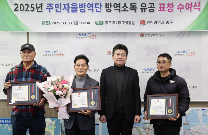 구는 이를 위해 지난 21일과 24일 각각 중구청 1청사와 2청사에서 ‘2025년 주민자율방역단 유공 표창 및 감사패 수여식’을 열고, 적극적이고 모범적인 활동을 펼친 모범 단원 총 8명에게 유공자 표창을 전달했다.