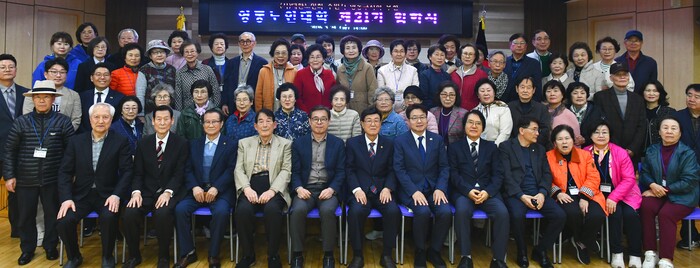 경기 수원시 영통구가 지난 24일 (사)대한노인회 수원시 영통구지회 주관으로 영통구지회에서 ‘영통노인대학 입학식’을 개최했다. 이날 입학식에는 신입생 50명과 내빈들이 참석했다. 사진은 장수석 구청장이 참석자들과 기념촬영을 하고 있는 모습. (사진=영통구청 제공)