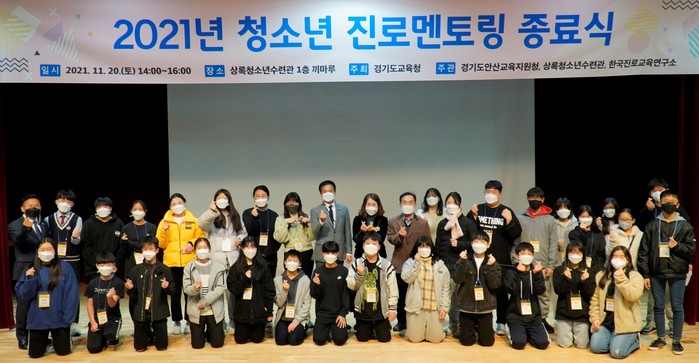 경기 안산시청소년재단 상록청소년수련관 진로체험센터에서 최근 ‘청소년 진로멘토링’ 종료식이 열렸다. 이 사업은 멘토와 멘티를 선발해 진로 결정에 어려움을 겪는 청소년들을 지원하는 프로그램으로 올해 6~11월 운영됐다. 사진은 종료식에서 멘토와 멘티 및 관계자들이 기념촬영을 하는 모습. (사진제공=안산시청)