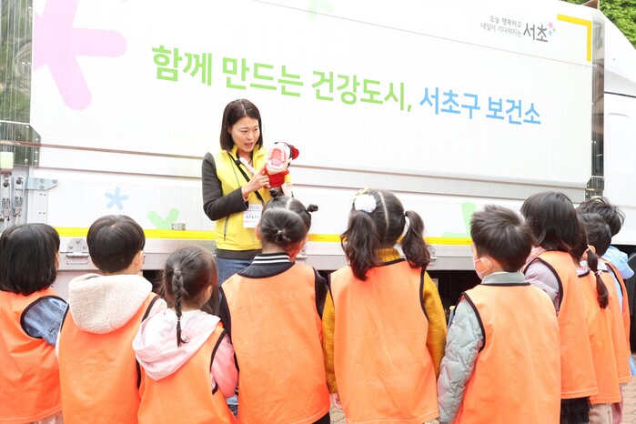 | ▲ 서초구, 올해 상반기 ‘찾아가는 보건소 건강체험관’ 행사에서 어린이들이 구강건강관리 부스에서 설명을 듣고 있다. (사진=서초구청 제공) |