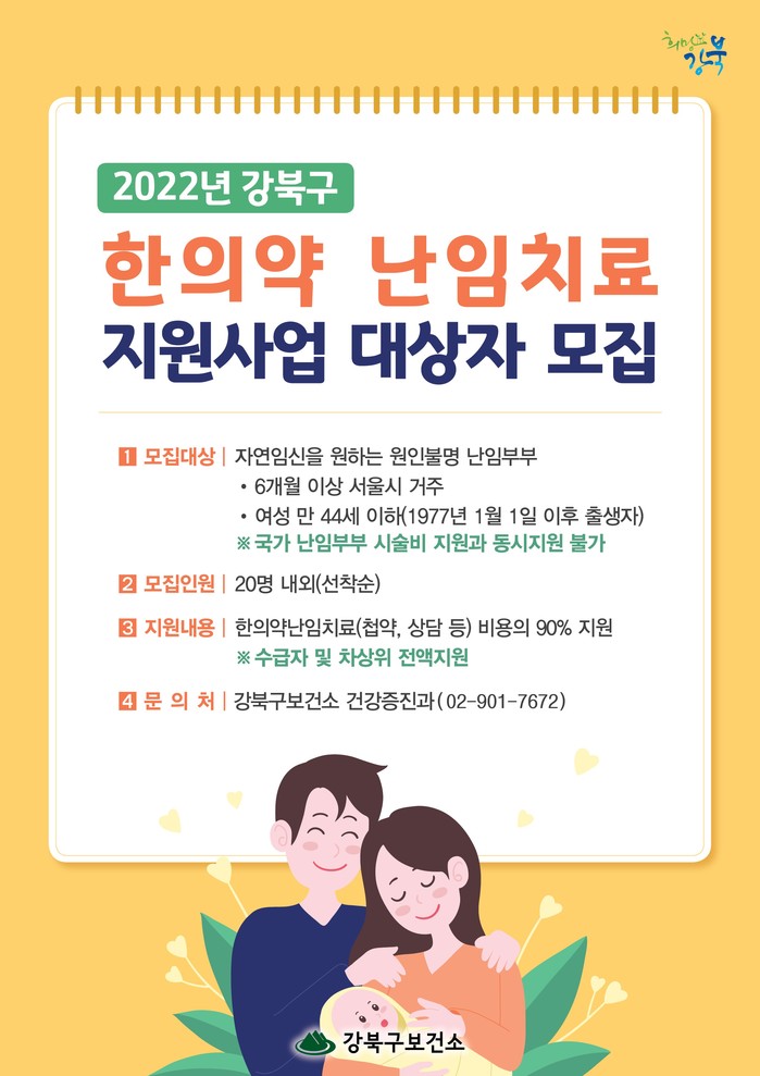 [시민일보 = 박준우 기자] 서울 강북구가 난임으로 어려움을 겪고 있는 난임부부들을 대상으로 한의약 난임치료를 지원한다고 7일 밝혔다.