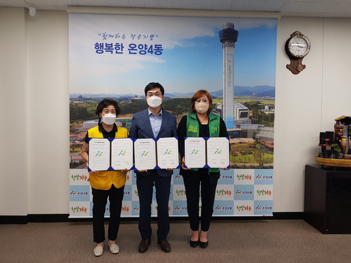 충남 아산시 온양4동행정복지센터가 13일 동 적십자봉사회·새마을부녀회와 위기가구 발굴을 위한 행복키움 업무협약을 맺고 회원들을 명예사회복지공무원으로 위촉했다. 협약으로 단체 회원들은 위기가구 발견시 동 찾아가는 보건복지팀에 신고하고, 찾아가는 보건복지팀은 해당 가구에 보건복지서비스를 지원하게 된다. 사진은 협약식에서 관계자들이 기념촬영을 하는 모습. (사진제공=아산시청)