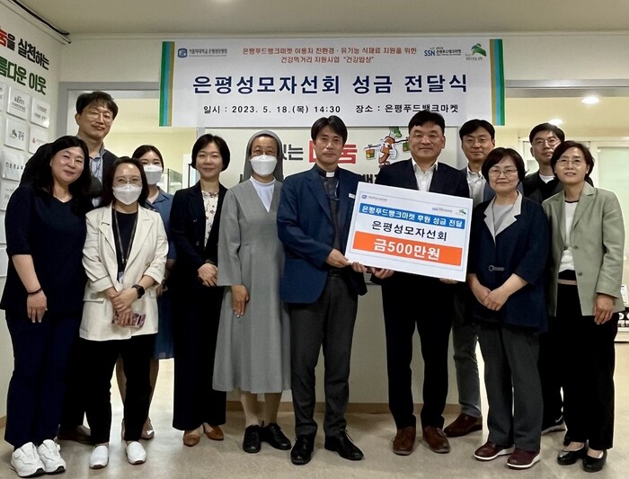 은평성모자선회는 은평성모병원 교직원들이 정성껏 모은 성금 500만원을 은평푸드뱅크마켓에 전달했다. 은평푸드뱅크마켓은 사회복지시설 및 등록 이용자에게 식품 등 생활용품을 지원하는 시설로, 이날 전달한 성금 전액은 건강 먹거리 지원사업 ‘건강밥상’을 통해 푸드마켓 이용자에게 친환경 유기농 식재료를 지원하기 위해 사용될 예정이다.
