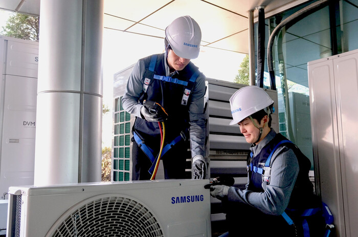 | ▲ 삼성전자서비스 엔지니어가 에어컨 사전점검 서비스를 제공하는 모습.(사진=삼성전자서비스 제공) |