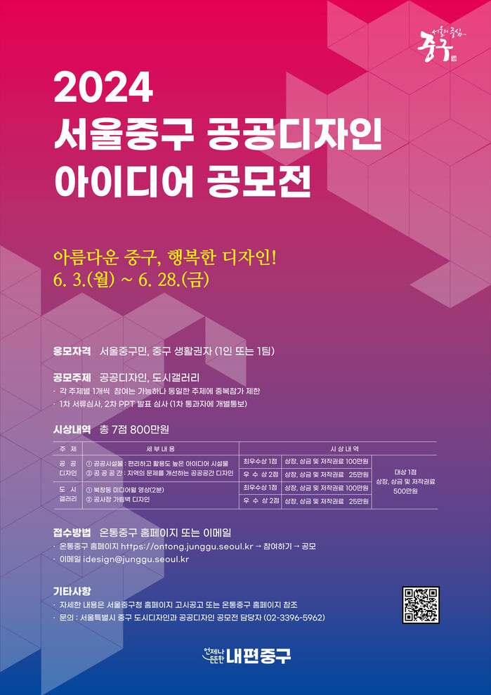 [시민일보 = 여영준 기자] 중구는 오는 28일까지 '공공디자인 아이디어 공모전'을 개최한다고 밝혔다.