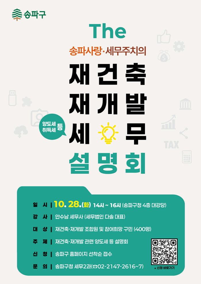 [시민일보 = 이대우 기자] 오는 28일 오후 2시 송파구청(구청장 서강석) 4층 대강당에서 구민 400여명을 대상으로 ‘재건축·재개발 세무 설명회’를 개최한다고 알렸다.
