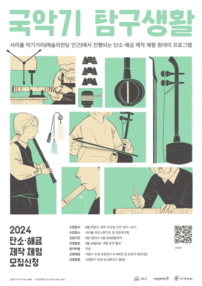단소 수업은 서리풀아트스튜디오(예술의전당 제1지하보도)와 국립국악원 국악박물관에서 이뤄지고, 해금 수업은 서리풀아트스튜디오에 ‘해금 연구소 무궁’ 제작자가 직접 방문해 진행될 예정이다.