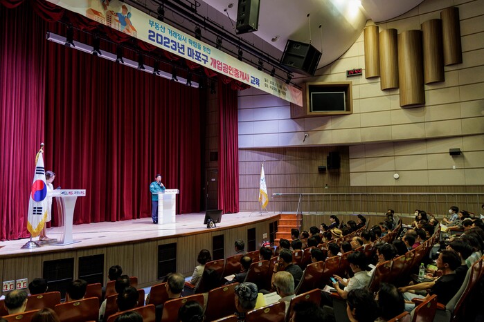 | ▲ 지난해 9월 부동산 중개업자 교육이 실시돼 마포구 중개보수 지원사업 설명이 진행됐다 (사진=마포구청 제공) |