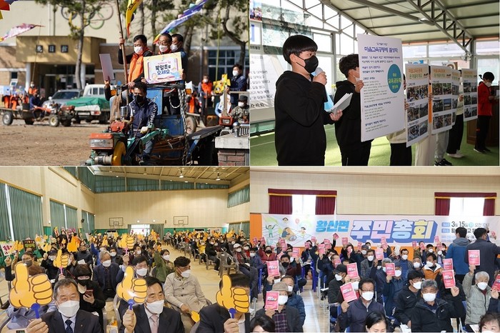 | ▲ 왼쪽 상단부터 북일초 작은학교 활성화 추진위 캠페인, 북평면 주민총회, 산이면 주민총회, 황산면 주민총회 모습 / 사진=해남군 제공 |