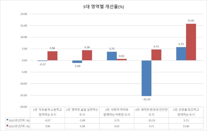 5대 분야 중 ‘문화를 창조하고 연대하는 도시’ 영역이 15.8%로 개선율이 가장 높았으며, ‘사회적 약자와 함께하는 따뜻한 도시’ 영역 개선율이 0.7%로 가장 낮게 나타났다.