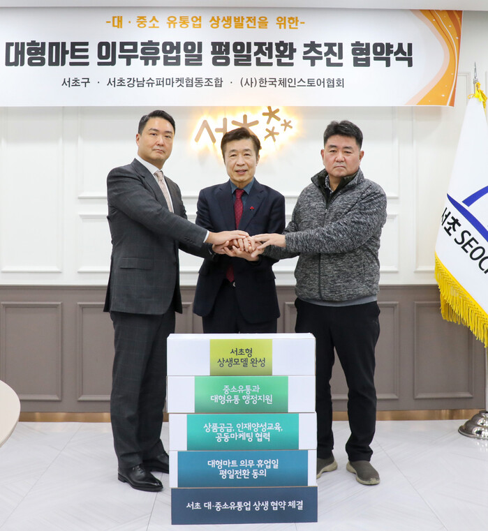 이번 대형마트 의무휴업일 평일 전환을 위해 구는 그간 8회에 걸쳐 중소유통과 대형마트 간 협의를 이어 왔으며, 이를 토대로 지난 달 19일 중소유통측을 대표하는 서초강남슈퍼마켓협동조합과 대형마트측 대표인 (사)한국체인스토어협회와 상생협약을 체결했다.
