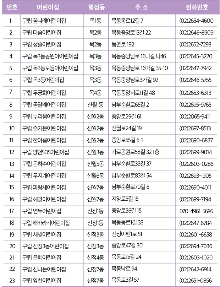 기존의 경우 지역내 운영 중인 365열린어린이집의 경우 구청 직장어린이집(신정 6동 소재) 1곳 뿐이어서 목동 및 신월동 지역 주민이 이용하기 어려웠던 점을 반영, 심야 돌봄 운영기관을 ▲신월동 9곳 ▲목동 7곳 ▲신정동 7곳 등 권역별로 확대했다.