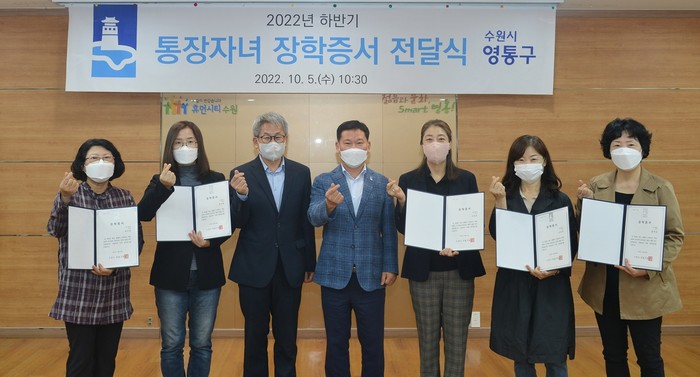 경기 수원시 영통구가 5일 지역사회 발전과 주민화합에 기여하고 있는 통장 자녀 7명을 장학생으로 선발해 장학증서를 전달했다. 이날 전달식에서는 지역발전을 위한 솔선수범하는 통장의 노고를 치하하고 장학금 수혜기쁨을 함께 나눴다. 사진은 이날 김선재 구청장(가운데)과 관계자들이 기념촬영을 하는 모습. (사진제공=영통구청)