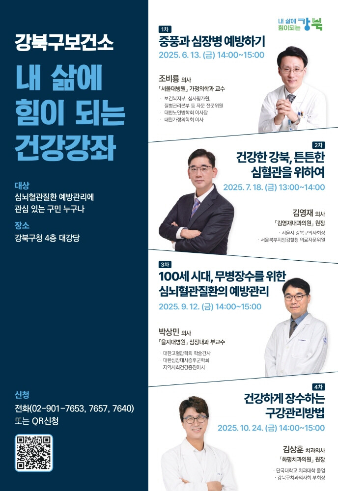 강좌는 심뇌혈관질환 예방에 관심 있는 구민이라면 누구나 무료로 참여할 수 있으며, 신청은 건강강좌 포스터 내 QR코드 또는 강북구보건소 건강증진과에 전화를 통해 가능하다. 접수는 선착순으로 진행된다.