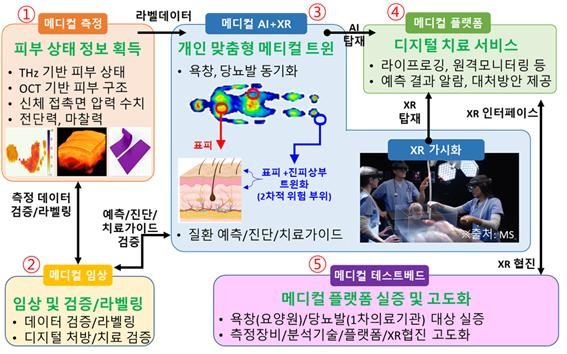 초고령화 시대 노인 만성질환 합병증 중 사회적 비용 지출이 큰 피부질환인 욕창과 당뇨발의 예방을 위해 ▲피부 상태와 중증 정도를 예측하고 적절한 치료를 위한 인공기능 기반 디지털 처방 기술 개발 ▲임상 데이터를 기반으로 개인 맞춤형 메디컬 트윈 구축 및 인공지능 활용 피부 질환의 예측, 진단, 치료가이드 모델 개발 ▲XR 기반 의료진 협진 시스템 개발 및 자가진단 및 질병예방을 위한 원격 모니터링 앱(웹)을 개발하게 된다.