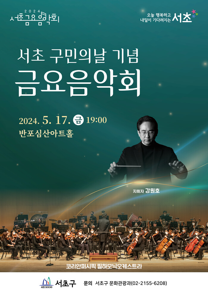 공연에는 2024 금요음악회 공모 선정팀이자, 서초에 기반을 두고 활동하고 있는 ‘코리안퍼시픽 필하모닉오케스트라’가 나선다. ‘고전을 탐하다’라는 주제로 하이든, 모차르트, 베토벤의 정통 클래식 연주로 고품격 음악을 선사할 예정이다.
