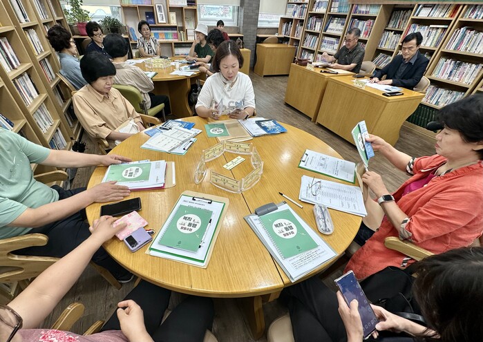 | ▲ ‘복지동행 활동수첩’과 주거취약 1인가구 전수조사를 위하여 교육 받고 있는 통장단 모습. (사진= 송파구청 제공) |