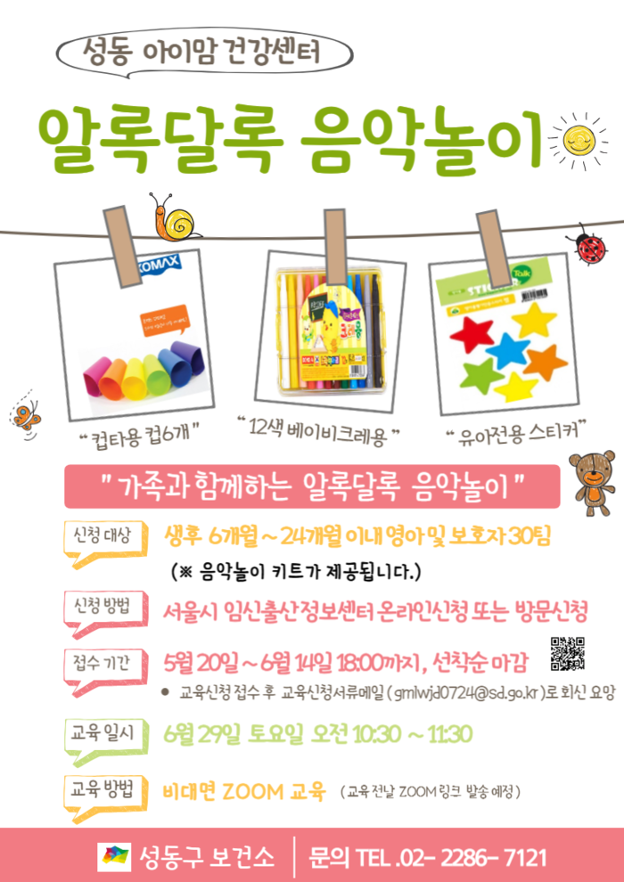 [시민일보 = 변은선 기자] 서울 성동구(구청장 정원오)는 오는 29일 생후 6~24개월 영유아 양육가정을 대상으로 토요 비대면 음악놀이 교실 특강을 운영한다.