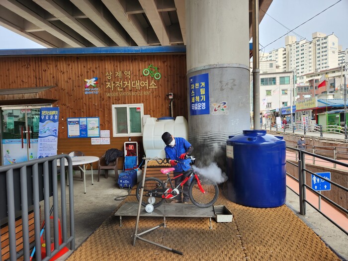 | ▲ 자전거 스팀세척기 운영 모습. (사진=노원구청 제공) |