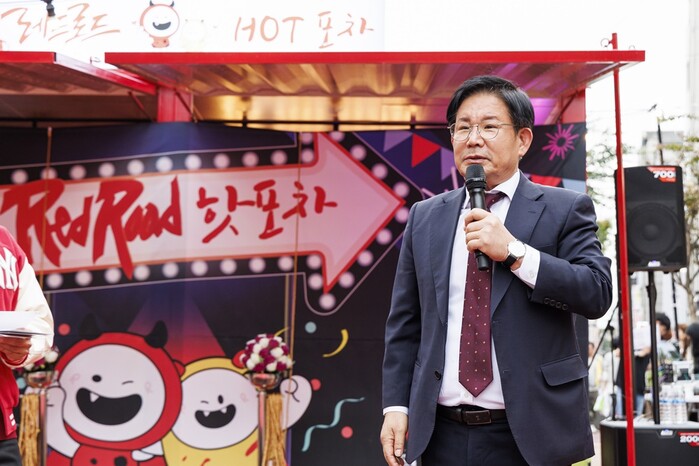 | ▲ 2023년도 주민참여예산으로 홍대 레드로드 일대에 설치된 레드로드핫포파에 방만한 박강수 구청장. (사진=마포구청 제공) |