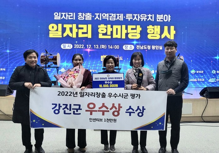 [강진=정찬남 기자] 전남 강진군이 전라남도 주관 22개 시·군 대상‘2022년 일자리창출 실천 협약식 및 일자리 한마당행사’에서 일자리 창출 부문 우수상 수상과 함께 인센티브 1천만 원을 확보했다.