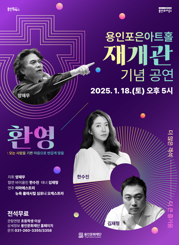 용인포은아트홀 재개관 기념 ‘새로운 출발’과 ‘환영’의 메시지를 담은 이번 무대는 이마에스트리 단원과 뉴욕 클래시컬 심포니 오케스트라 등 총 100여 명의 출연진과 바이올리니스트 한수진, 테너 김재형이 협연자로 한 무대에 서며 장관을 연출할 예정이다.