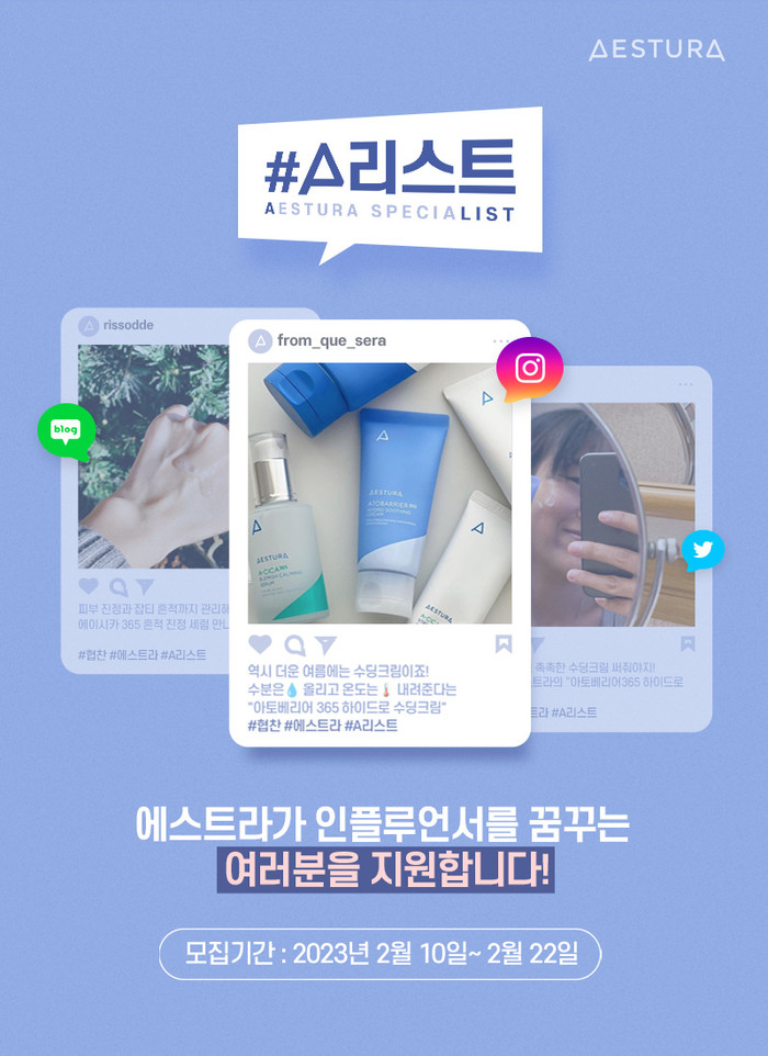 ‘A리스트’는 에스트라(AESTURA)와 스페셜리스트(specialist)의 합성어로, 에스트라 브랜드를 좋아하고 개인 소셜미디어(SNS) 채널을 활발히 운영하는 사람이라면 누구나 지원 가능하다.