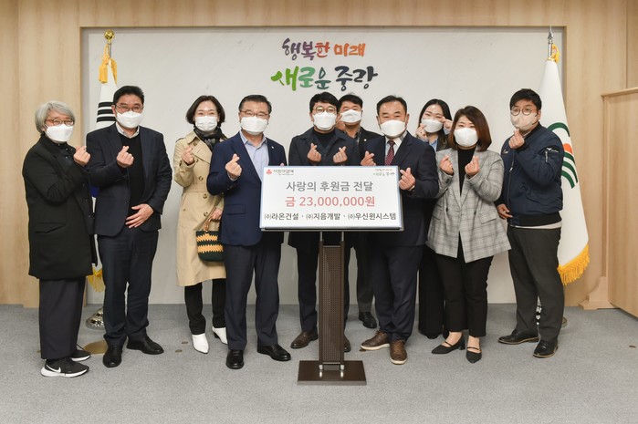 서울 중랑구 면목7동 주민센터는 최근 라온건설과 지음개발, 우신윈시스템으로부터 총액 2300만원의 이웃돕기 성금을 전달받았다. 전달받은 성금은 여성청소년을 위한 위생용품을 지원하고 지역내 취약계층을 돕는 데 쓰일 예정이다. 사진은 이날 류경기 구청장(왼쪽 네 번째)이 관계자들과 기념촬영을 하는 모습. (사진제공=중랑구청)