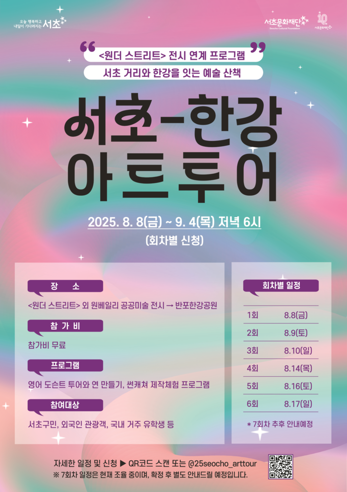 전성수 구청장은 “‘서초-한강 아트투어’를 통해 한강과 맞닿은 고터·관광특구에서 예술과 관광, 체험이 어우러지는 특별한 문화 경험을 선사하고자 한다”며 “앞으로도 서초만의 차별화된 관광자원과 예술 인프라를 연계해 글로벌 도시로서 경쟁력을 높여가겠다”고 밝혔다.