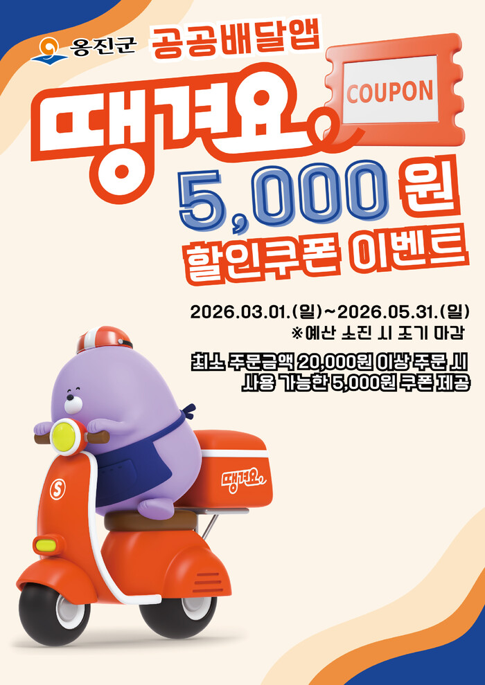 이벤트 기간은 2026년 3월 1일부터 5월 31일까지이며, 예산 소진 시 조기 종료된다. 쿠폰은 옹진군 관내 「땡겨요」 가맹점에서 주문하는 이용자라면 누구나 앱을 통해 내려받을 수 있으며, 발급 당일에 한해 사용할 수 있다.