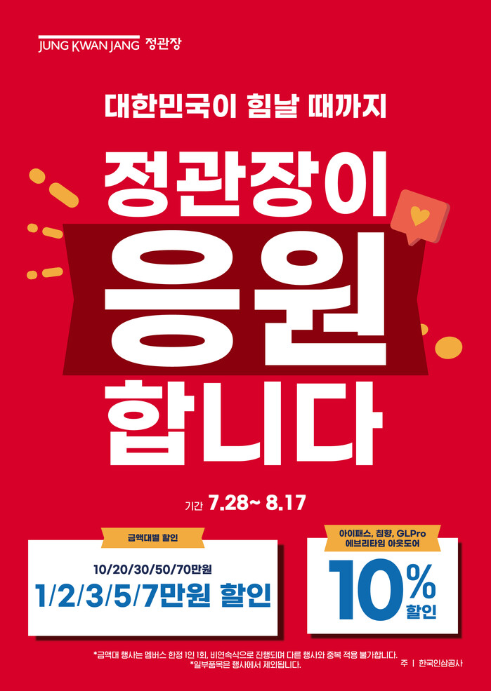 KGC인삼공사 관계자는 “소비쿠폰을 통해 소비자들이 보다 쉽게 건강관리에 관심을 가질 수 있도록 다양한 혜택을 마련했으며, 전국 가맹점에서 정관장의 건강 설루션을 누릴 수 있도록 기획했다”며, “이번 프로모션을 통해 건강기능식품 구매를 망설였던 소비자들에게 좋은 기회가 될 것으로 기대된다”고 전했다.