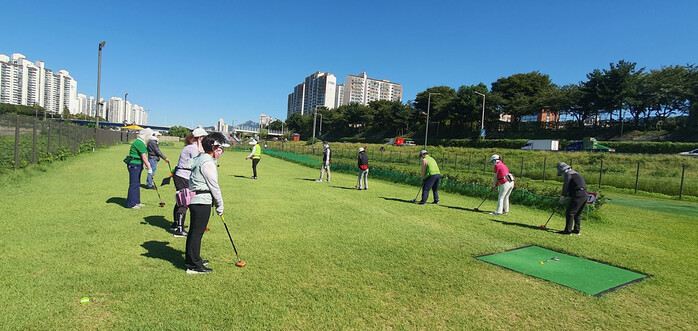 | ▲ 중랑천 둔치 중랑구립파크골프장에서 시민들이 골프를 치고 있다. (사진=중랑구청 제공) |