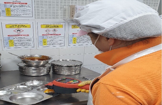 | ▲ 성동구에서 지원한 방사능 측정기로 식재료의 방사능을 확인하는 모습. (사진=성동구청 제공) |