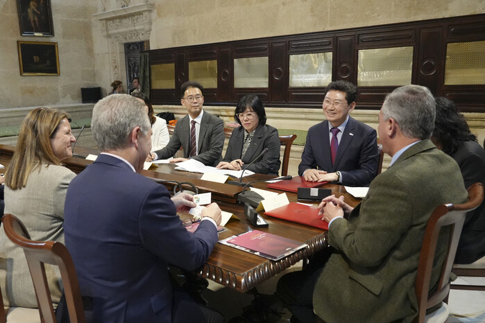 | ▲ 이상일 용인특례시장이 지난해 2월 22일 스페인 세비야 시청을 방문해 호세 루이스 산즈 시장과 우호교류의향서를 교환한 뒤 시 관계자들과 교류 협력 방안을 논의하는 모습 |
